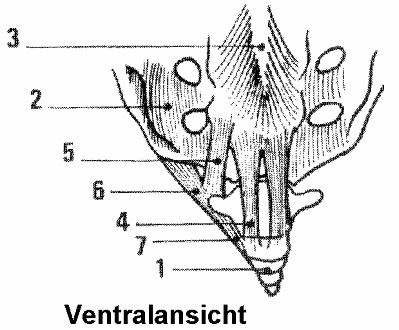 Auf der Ventralseite des Kreuzbeines läuft das Ligamentum longitudinale anterius (3) aus und setzt sich in das Ligamentum sacrococcygeum ventrale fort. Desweiteren sind drei lateral ziehende Ligamenta sacrococcygea (5,6,7) zu erkennen.